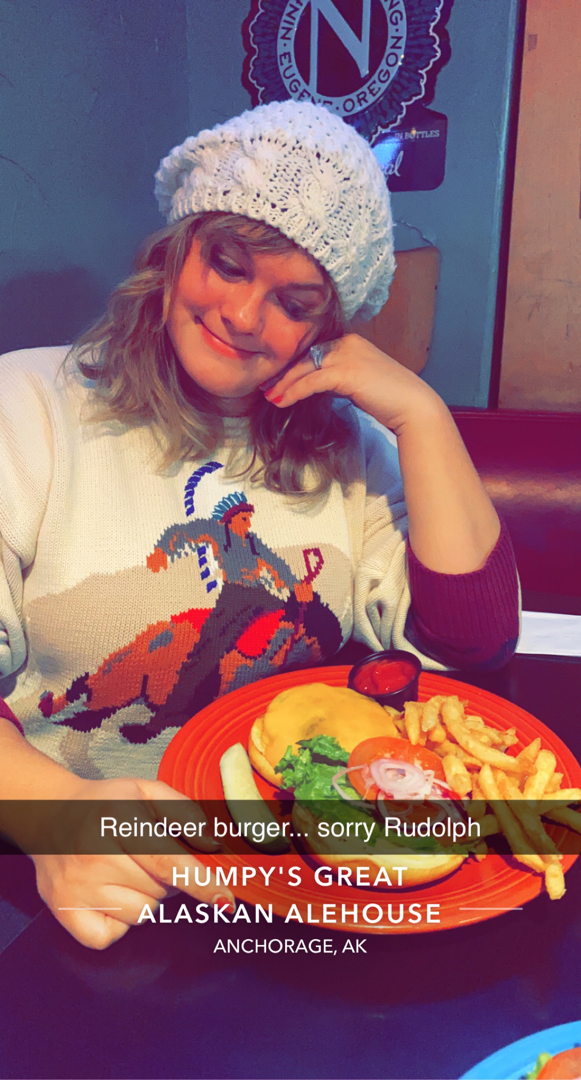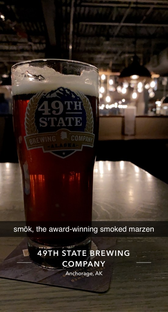 For a drink (actually, dinner too, go here instead of Humpy’s), I would recommend 49th State Brewing. They have a smoky märzen (my favorite beer) called Smōk that was so, so delicious. The interior is nice, too. I think just about any “best beer/bar in Anchorage” blog post or article will point you to 49th State first, but you should also check out Midnight Sun Brewing Co. Midnight Sun features more IPAs and lagers, but has a nice selection for all tastes.